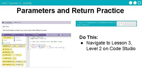 The course is often us. Explain why lesson is important to participants. Mark for review (1) points. The symbol = is used in if statements and == is used in loops. In the lesson, you will be practicing programming with parameters and return values through a set of programming puzzles.